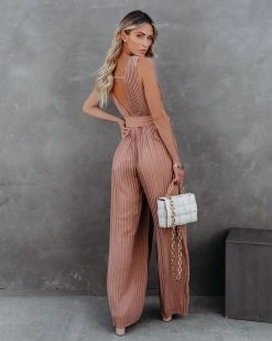 ON T-001 High Tea Pleated Wide Leg Belted Jumpsuit – Mocha – FINAL SALE