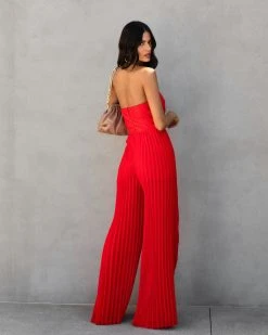 DO+B-001 VIP Strapless Faux Leather Pleated Jumpsuit – Red – FINAL SALE