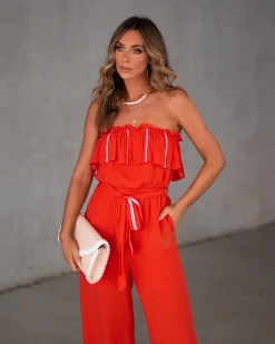 SUGA-001 Antonella Off The Shoulder Pocketed Jumpsuit – Red – SALE