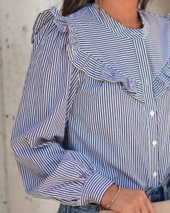 BLUE-001 9 To 5 Cotton Ruffle Stripe Button Top – FINAL SALE