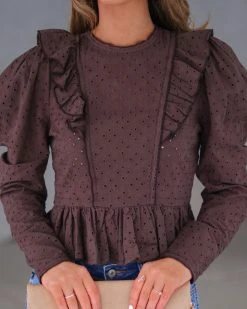 OLIV-001 Dustin Eyelet Ruffle Puff Sleeve Top – Chocolate – SALE
