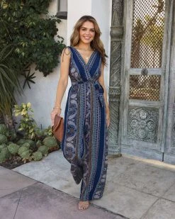 Sayulita is calling in the Dimitra Pocketed Jumpsuit in navy multi that features an adjustable waistband.