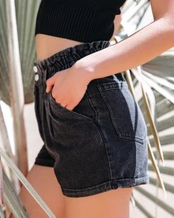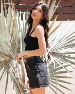 Our Dominique High Waisted Denim Shorts look classy while maintaining comfort! These black wash high waisted denim shorts are designed with a sewn cuffed hem and front fly zipper and button closures. Styled with the Perfect Hoop Earrings, Aria Choker Necklace, The Buddha Wheel Necklace, Lexi Chain Ring, Simple Bangle Bracelet, Pyramid Cuff Bracelet, and Urban Ribbed Knit Crop Top.