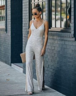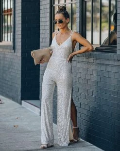 //Best Seller// Our Just Bust A Move Sequin Slit Jumpsuit is an absolute knockout! Champagne sequins embellish the look from head to toe. Designed with a v-neckline that’s supported by adjustable criss-cross straps and a true to size fit with subtle stretch for comfort. High side slits along the pant legs add a stunning detail for a final touch! Finished with a fully lining and concealed back zipper closure.