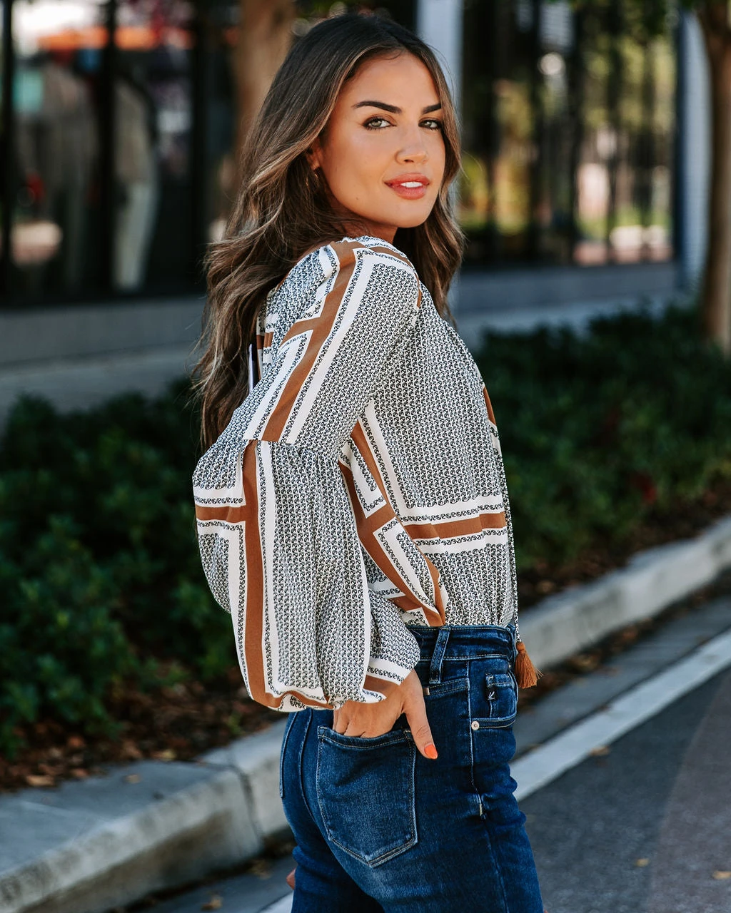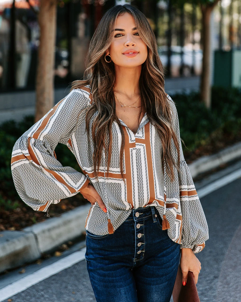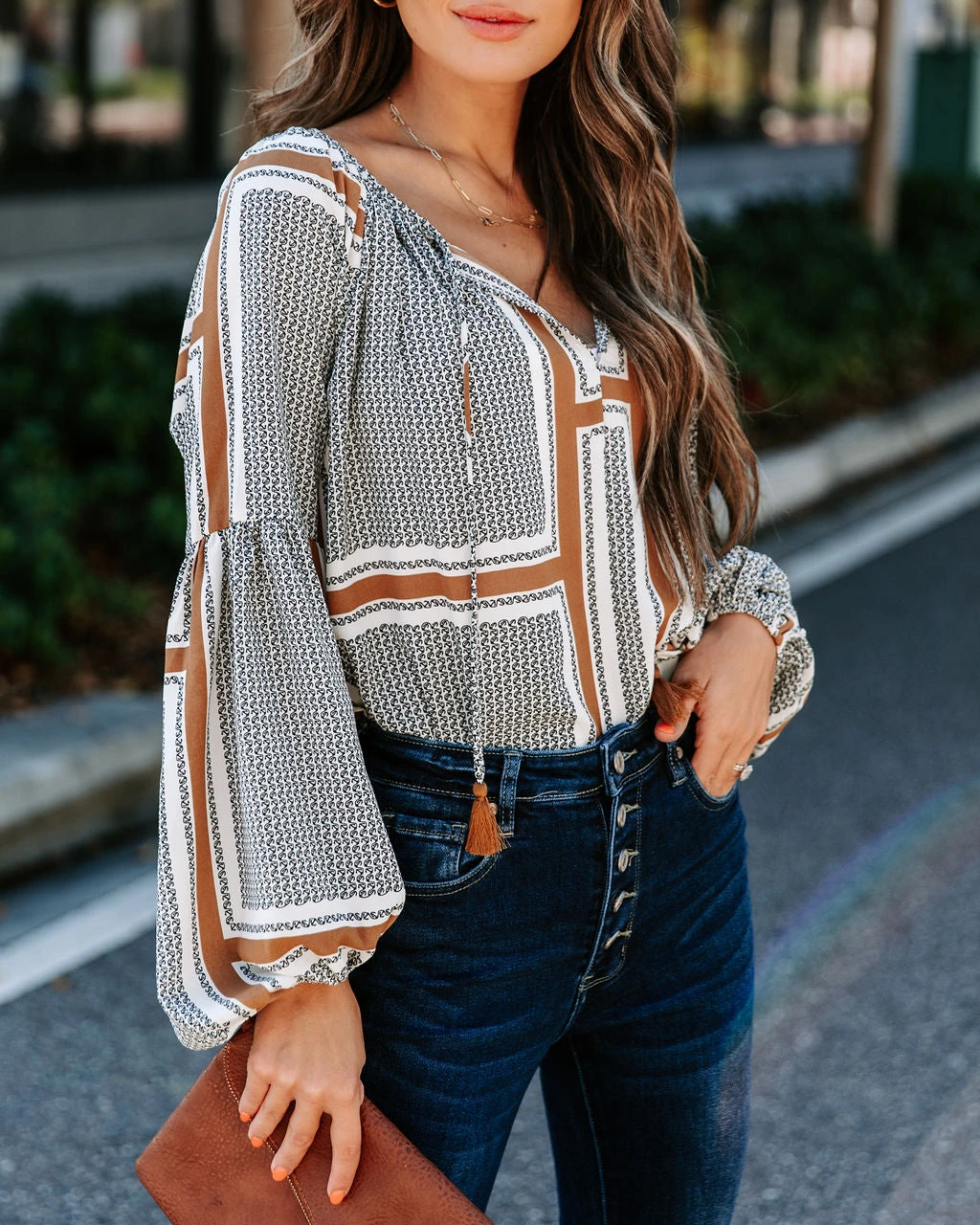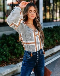 Upgrade your top game in the Time Will Tell Printed Tassel Tie Blouse in grey multi that features a split neckline.