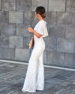 Turn heads in the Trophy Wife Sequin Jumpsuit in silver that features flare pants and a plunging neckline.