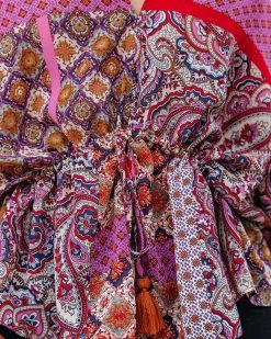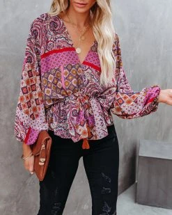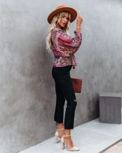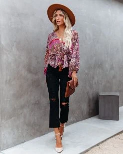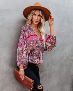 Our Yvie Patchwork Drawstring Blouse mixes boho and 70’s! Magenta, cream, navy, sage, red, and ivory hues make up this whimsical top. Designed with a drawstring waistband and a v-neckline. Styled with the El Dorado Hat, Perfect Hoop Earrings, Chloe Mini Necklace, Simple Bangle Bracelet, Ritual Pendant Necklace, Ana Gold Coin Lariat, Stella Crossbody Envelope Zip Clutch, Sharma High Rise Distressed Denim, and Ritz Faux Suede Pointed Heel.