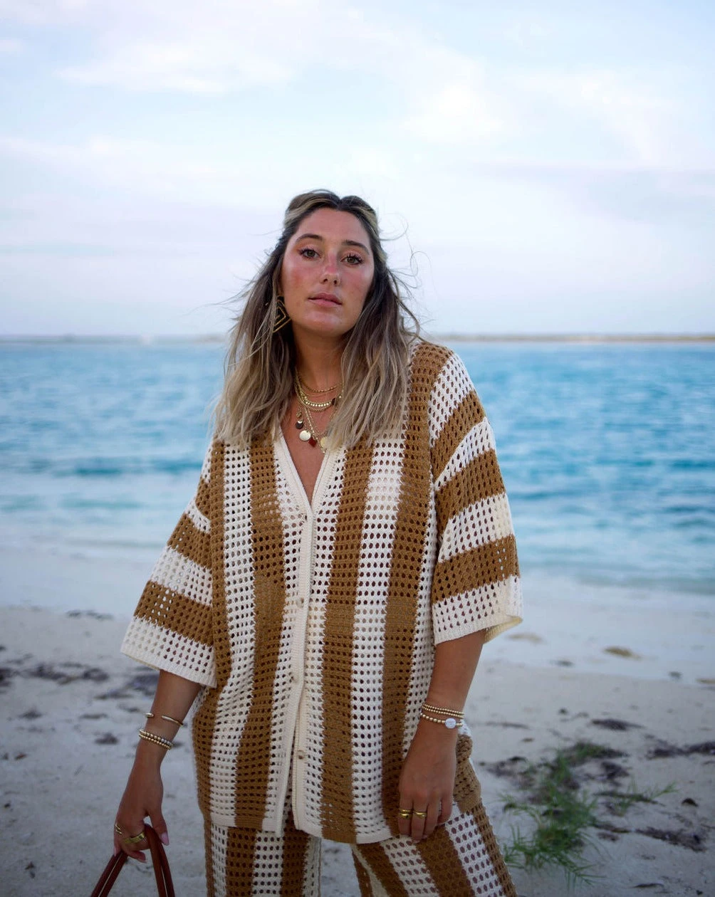 Model is wearing a Size Small. Height is 5’6”, Bust is 32”, Waist is 27”, Hips 36”