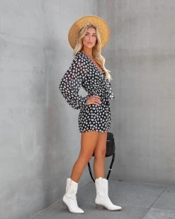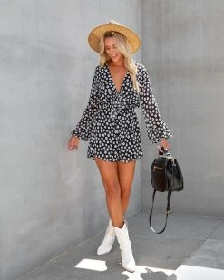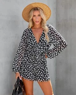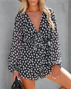 Dress up your Sunday in the Harmonia Floral Romper in black that features a v-neckline and a bust tie.