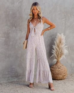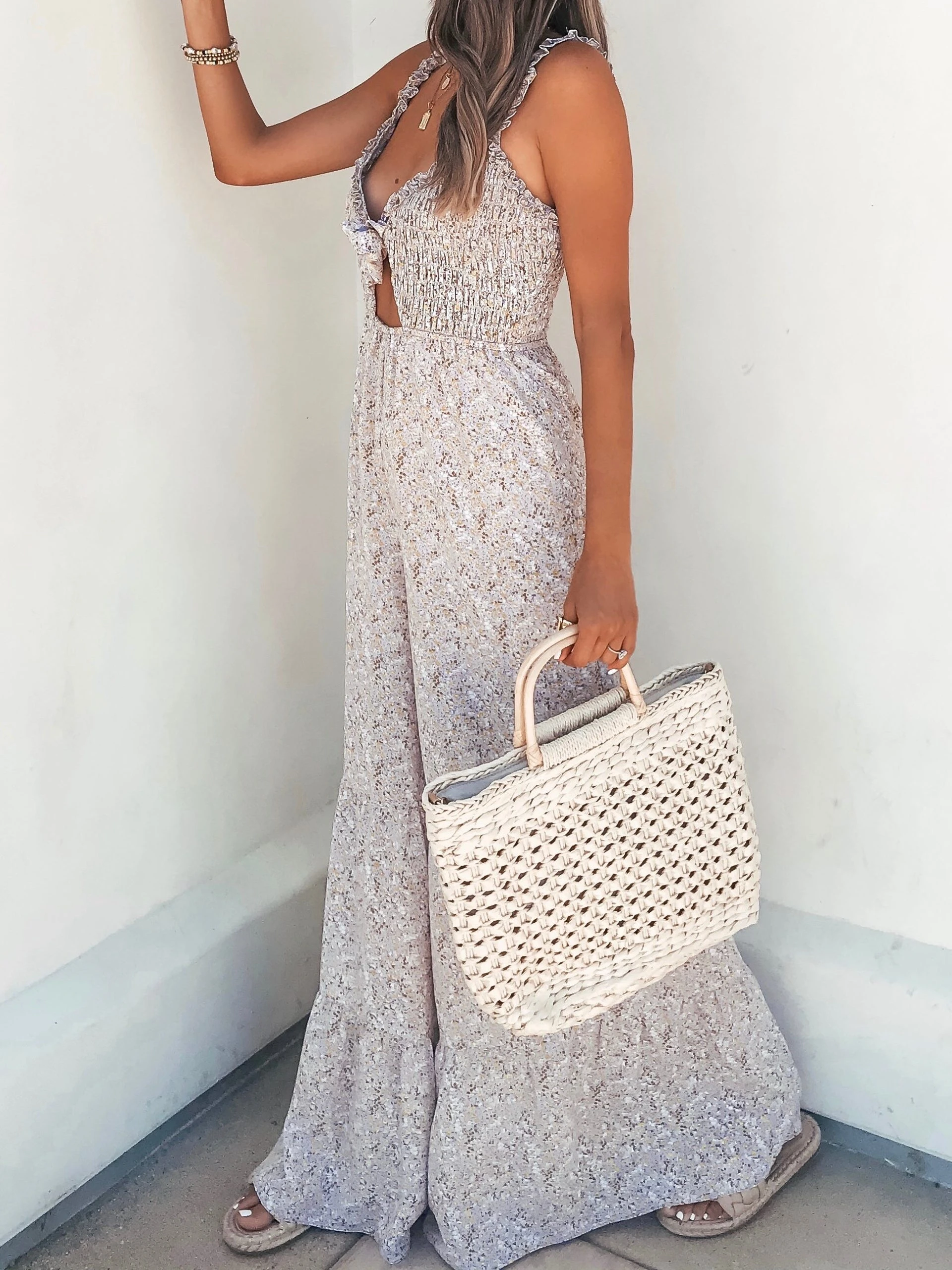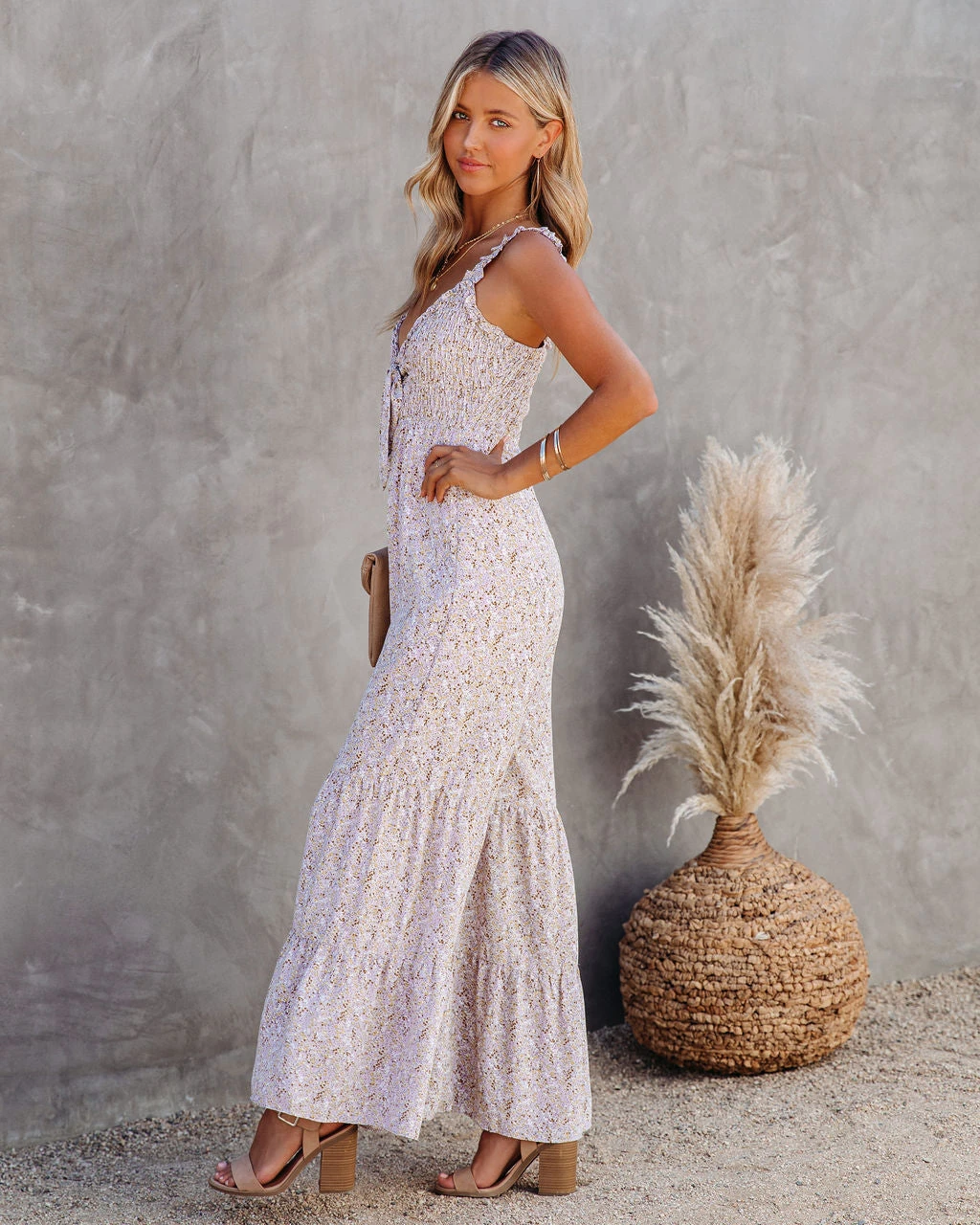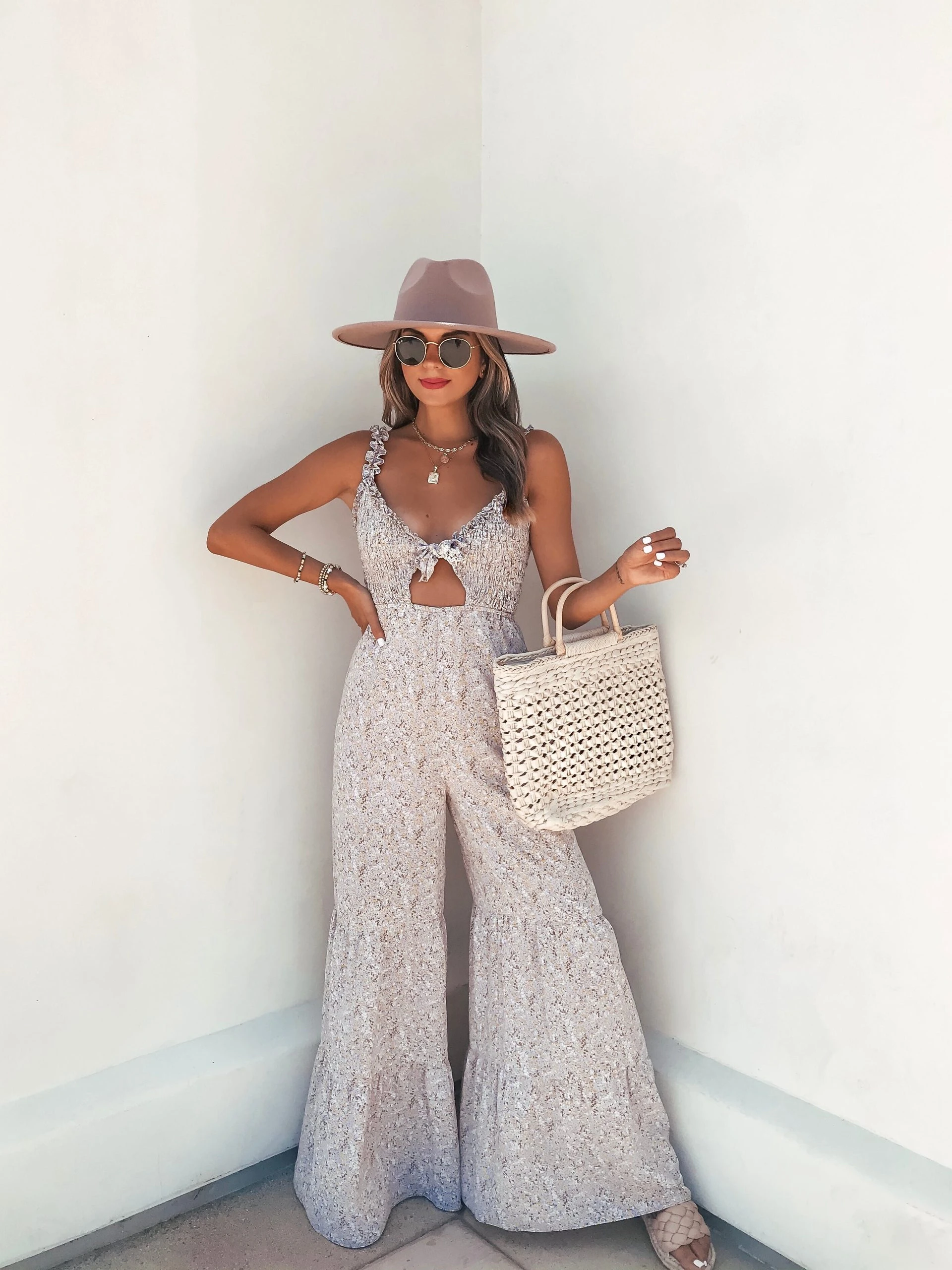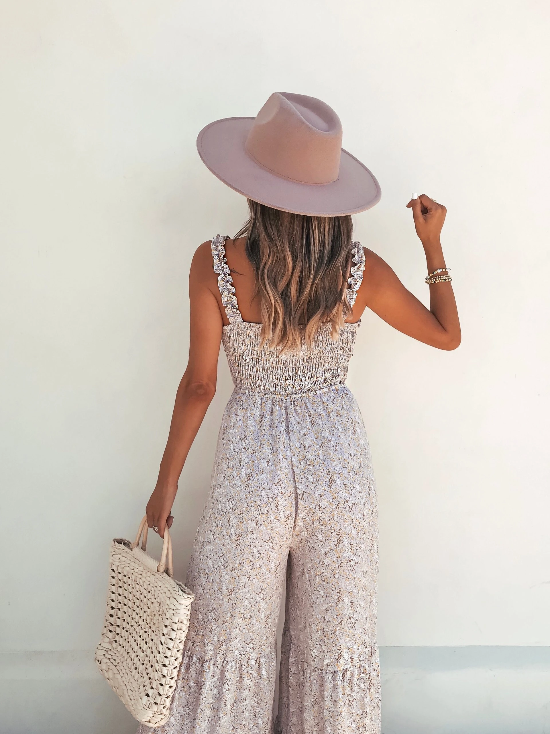 //VICI Exclusive// Stroll the vineyards in our Heather Floral Smocked Wide Leg Jumpsuit! Lavender, mustard, mocha, charcoal, and ivory florals make up this piece. Designed with a smocked bust and a tie front. Styled with the Perfect Hoop Earrings, Chloe Mini Necklace, Elena Pendant Necklace, Compass Coin Necklace, Simple Bangle Bracelet, Stella Crossbody Envelope Zip Clutch, and Cooper Block Heeled Sandal.Β