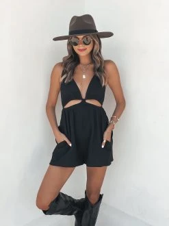 //VICI Exclusive// Cutout rompers are such a hot trend! Our Jaye Cotton Pocketed Cutout Romper comes in a classic black hue. Designed with a plunging neckline and cutouts, this romper shows some skin! Finished with side pockets. Styled with the Bondi Lace Straw Hat, Perfect Hoop Earrings, Chloe Mini Necklace, Elena Pendant Necklace, Compass Coin Necklace, Simple Bangle Bracelet, Highland Bag, and Airway Faux Leather Sandal.