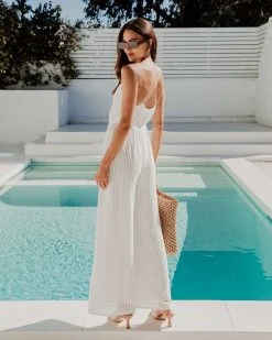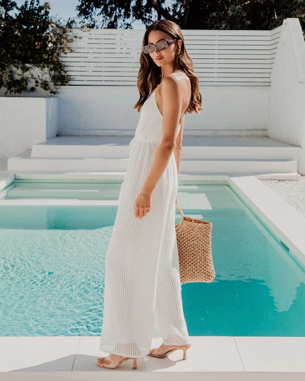 Dress up for your event in the Maui Crochet Wide Leg Jumpsuit in white that features a low neckline.
