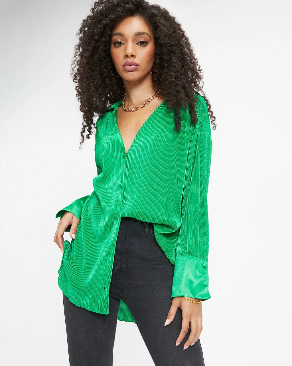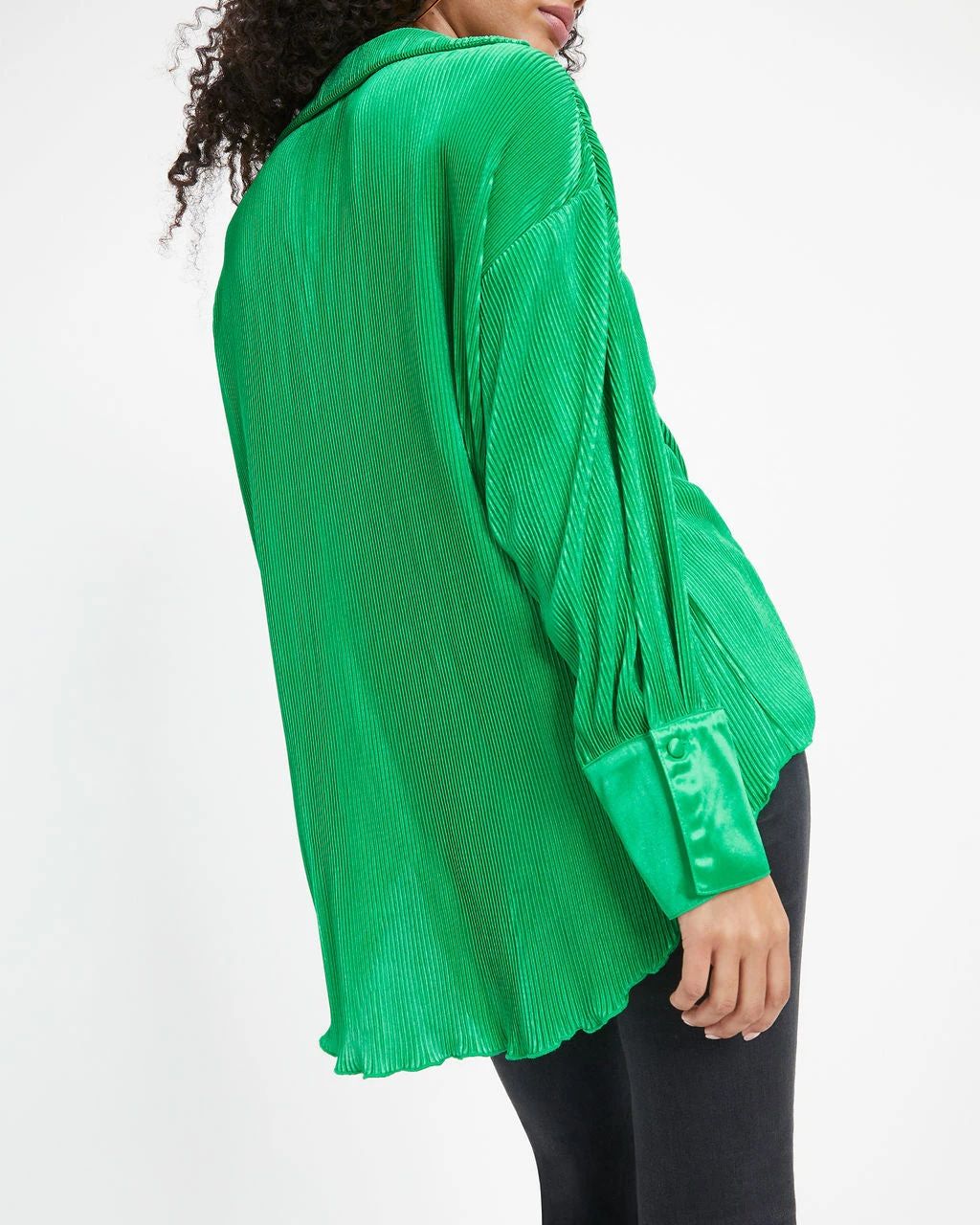 Brighten up your wardrobe in the Milan Plisse Button Down Top in emerald that features front button closures.
