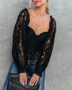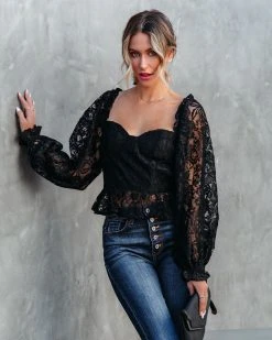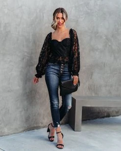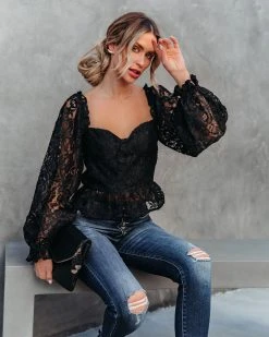 //VICI Exclusive// Our Ready To Mingle Cropped Lace Peplum Blouse is a femme date night look! This black colored top features a sweetheart neckline. Designed with elastic cuffs. Styled with the Lorey Baguette Ear Crawlers, Chloe Mini Necklace, Stella Crossbody Envelope Zip Clutch, Tilley Frayed Ankle High Waisted Skinny, and Whimsy Heel.