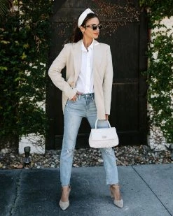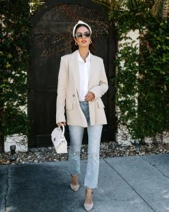 Your Spring closet NEEDS the Whinn Pocketed Blazer in tan that’s detailed with front button closures.