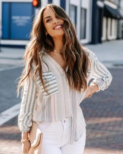 //VICI Exclusive/ Look chic as ever in the Cultivate Striped Button Down Top featuring a navy, seafoam, rust and white striped print on a lightweight challis base.