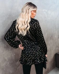 The Dante Metallic Ruffle Tie Blouse is such a cute holiday top! This black blouse has gold metallic polka dots and a plunging neckline with a ruffle trim. Finished with an adjustable tie closure. Styled with the Perfect Hoop Earrings, Minimal Herringbone Necklace, Bali Necklace, Stella Crossbody Envelope Zip Clutch, Volt High Rise Distressed Skinny, and Darby Heeled Slouch Bootie.