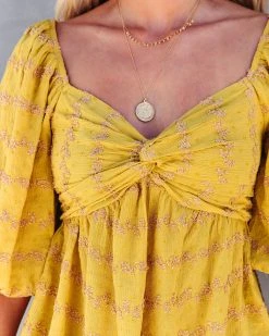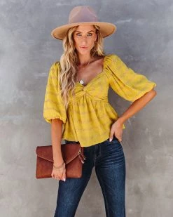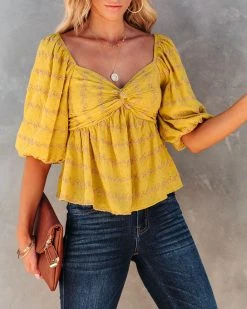 Girly and fun, the Divine Textured Puff Sleeve Top in mustard features a twisted front.