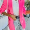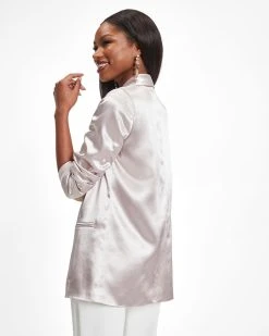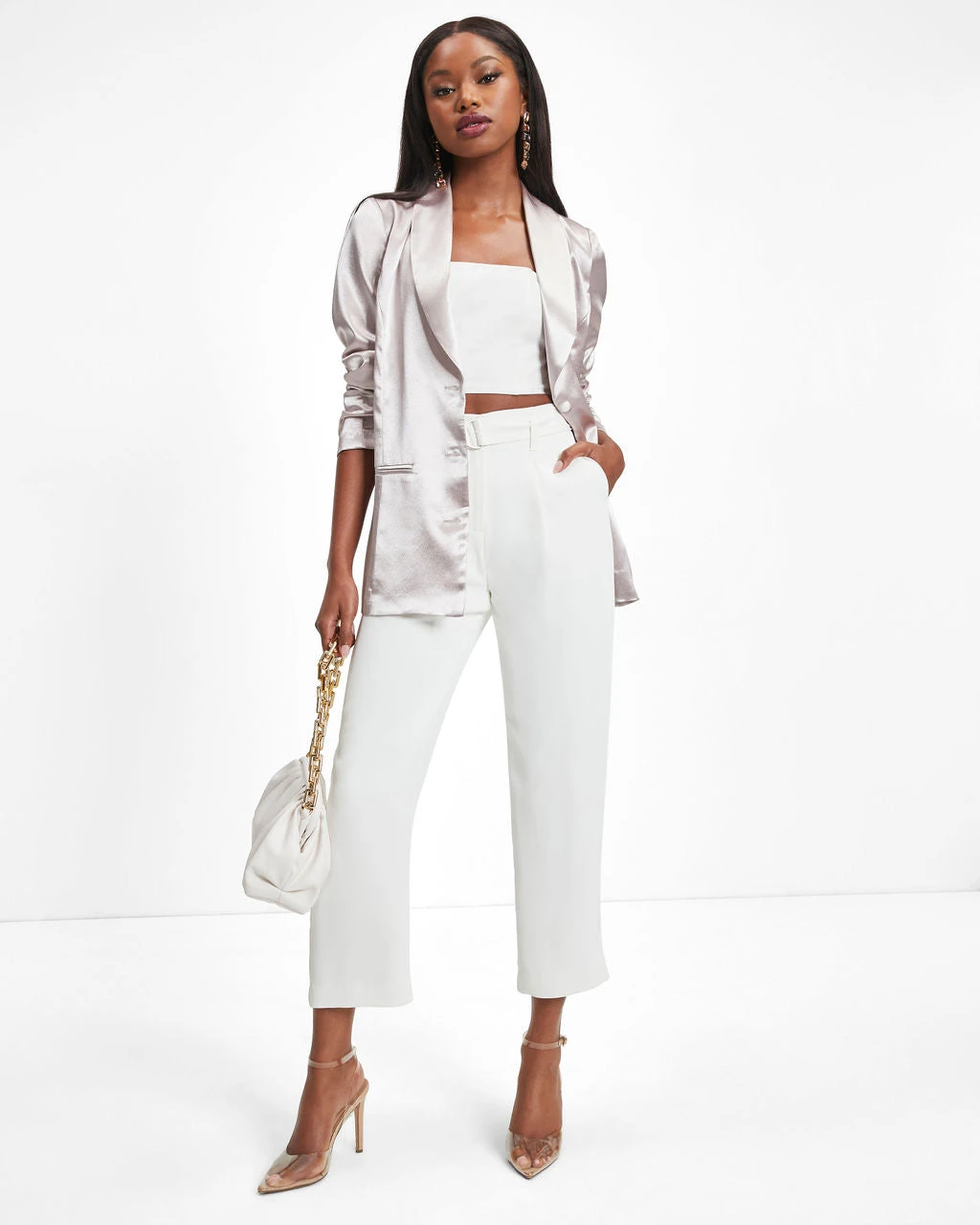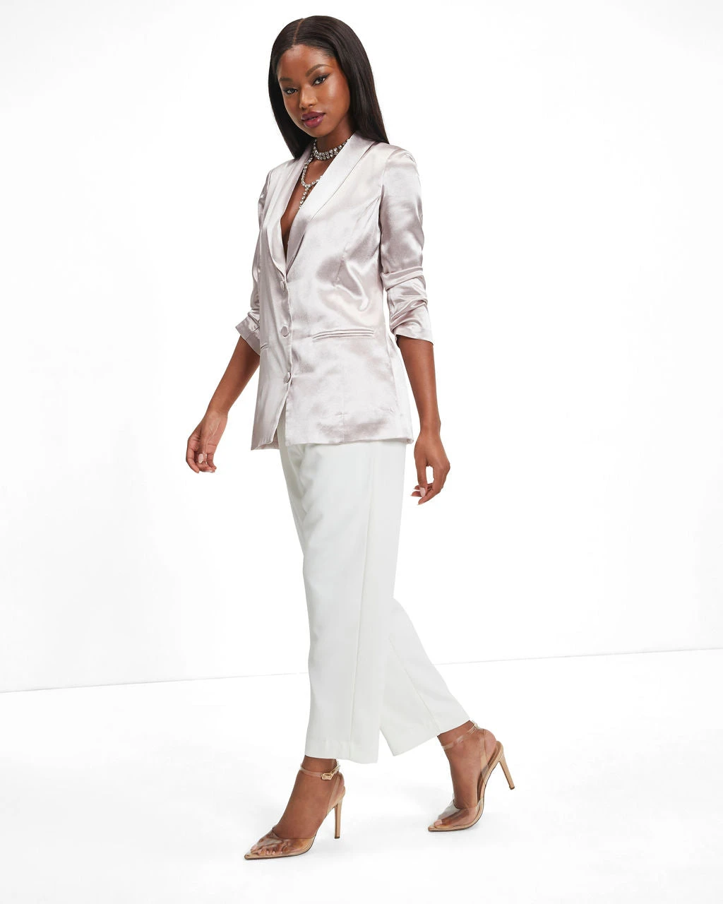 Stand out from the crowd in the Perla Pocketed Satin Blazer in champagne that features a shawl neckline.