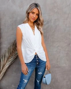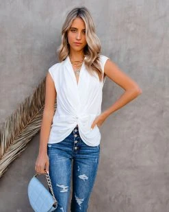 It’s finally warm enough to break out a sleeveless blouse! Our Waka Sleeveless Twist Blouse is a white hue with a relaxed fit and a v-neckline. A twist front adorns the front of this day or night piece. Styled with the Roxy Hoops, Lou Tag Necklace, On Demand Herringbone Chain Necklace, Share The Love Compass Necklace, Holly Quilted Chain Crossbody Bag, Ultimate High Rise Split Ankle Distressed Skinny, and Sinatra Faux Suede Pointed Heel.