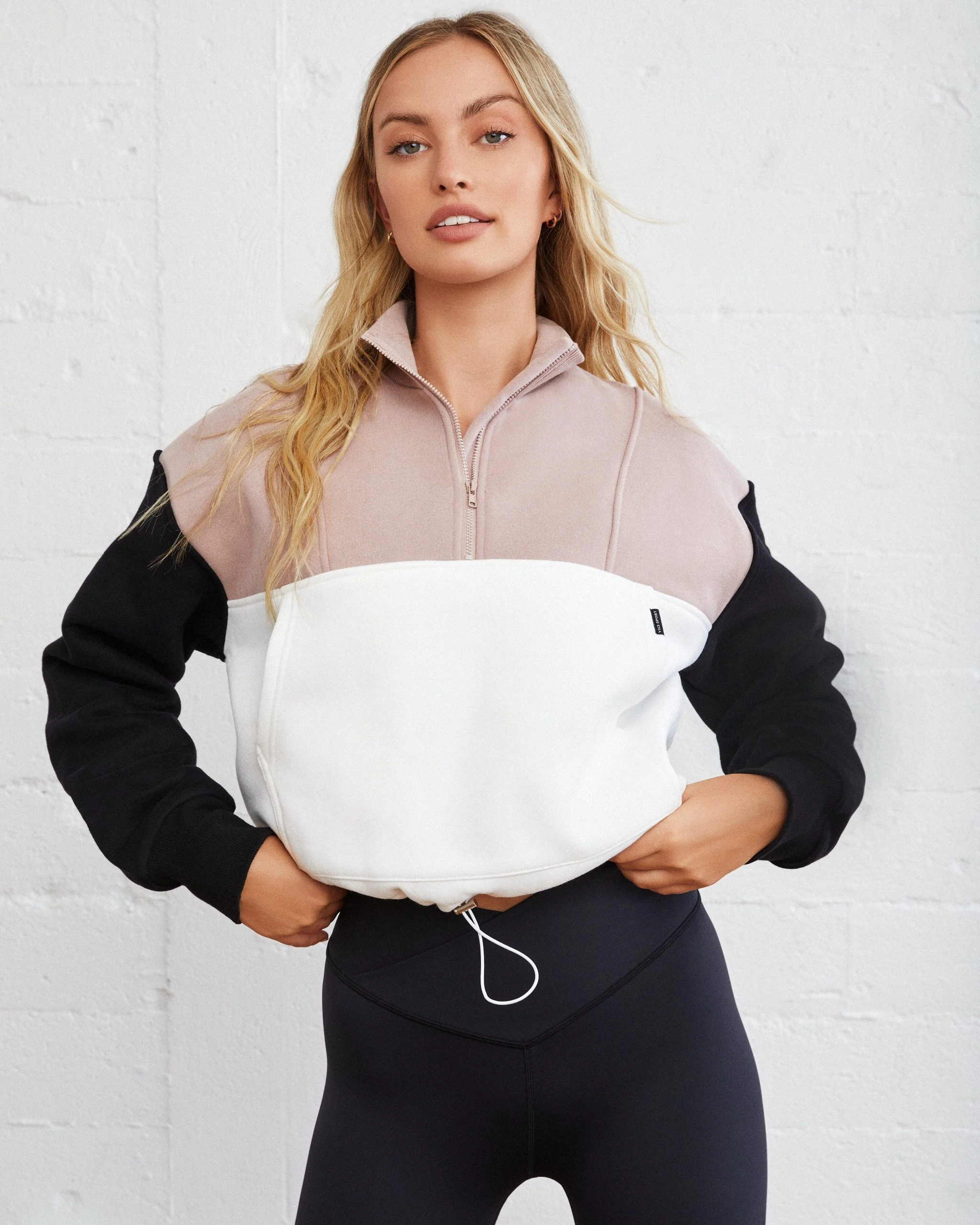 //VICI Exclusive// Show your sporty side in our Circuit Cotton Blend Pocketed Half Zip Pullover! Black, mauve, and white hues detail this piece. Designed with a kangaroo pocket and ribbed edges. Styled with the Sporty Slide Sandal and Total Body Criss Cross Legging.