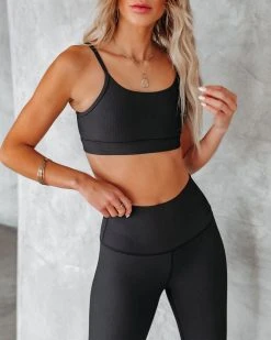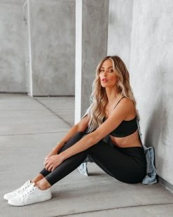 The most flattering workout set! Our Equipped Ribbed Sports Bra in black features a removable padding. Designed in a moisture wicking and 4 way stretch fabrication. Styled with the Perfect Hoop Earrings, Chloe Mini Necklace, Initial Card Necklace, Simple Bangle Bracelet, Josie Pocketed Vintage Denim Jacket, Equipped Ribbed Legging, and Common Thread Sneaker.