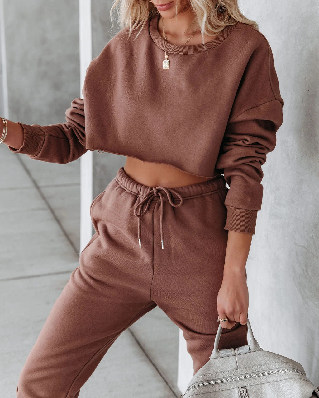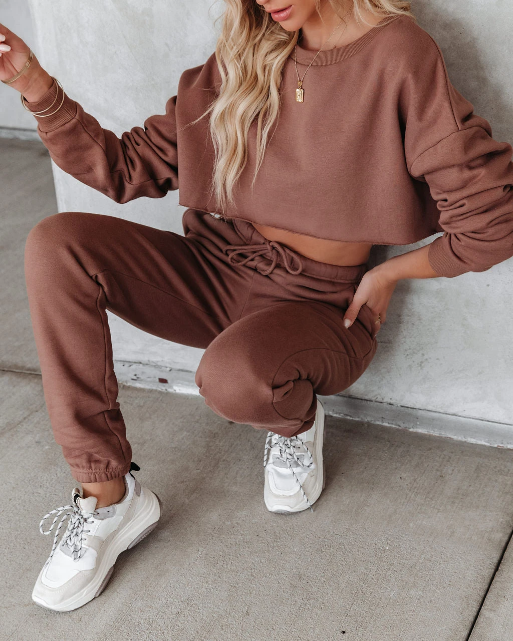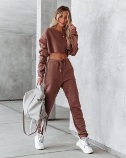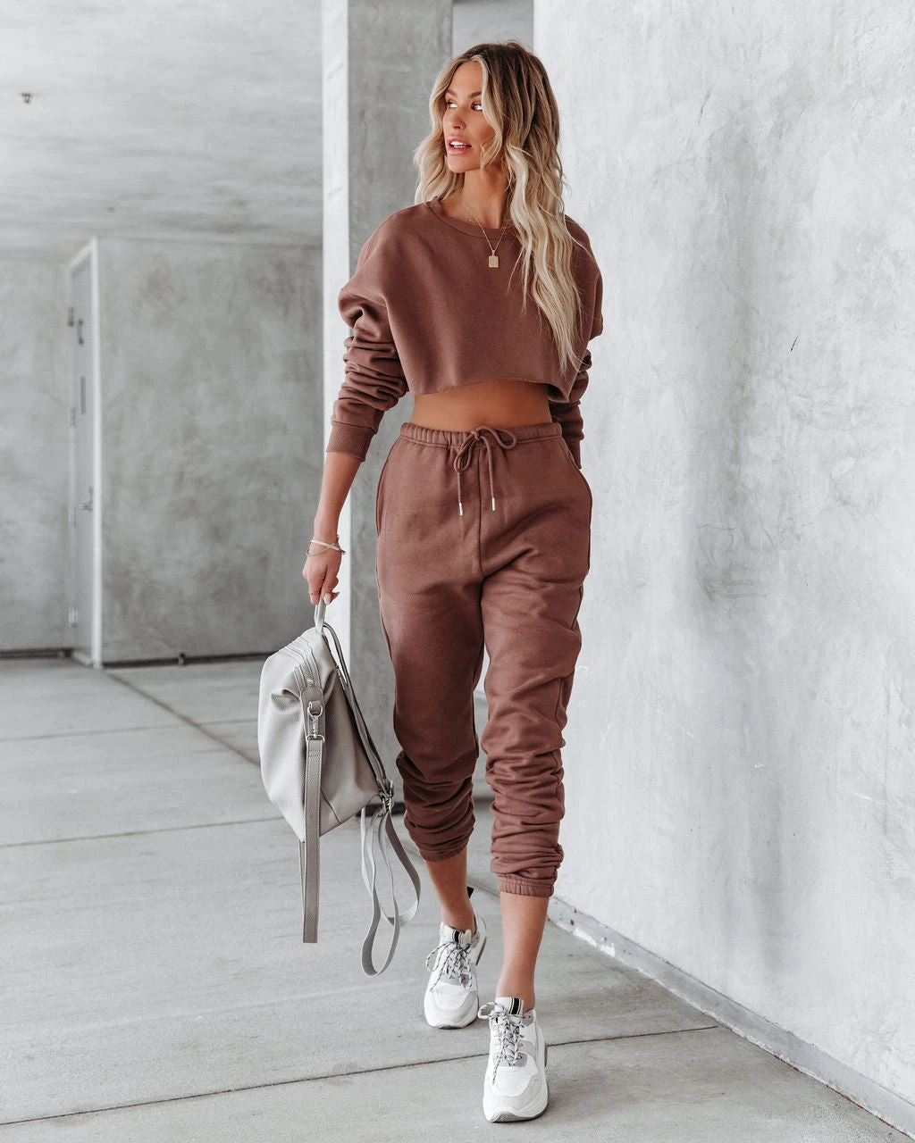 Kick back and relax in this latte colored set! Our Jordyn Cotton Blend Cropped Sweatshirt features a crew neckline and ribbed edges. Designed with a raw hemline. Styled with the Perfect Hoop Earrings, Chloe Mini Necklace, Initial Card Necklace, Simple Bangle Bracelet, Kenzie Backpack, Jordyn Cotton Blend Pocketed Joggers, and Perla Running Sole Sneaker.