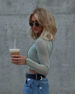 Cool girls will love the Can’t Hardly Wait Sheer Mesh Top in sage that features a shorter fit.