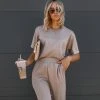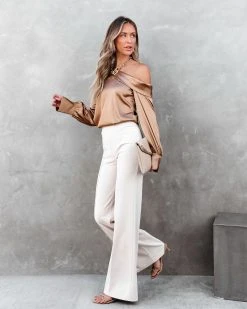 Luxe meets lovely in the Expensive Taste Satin Off The Shoulder Top in camel that features slit cuffs.