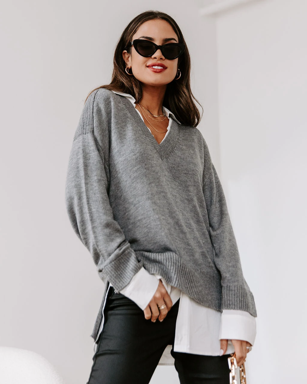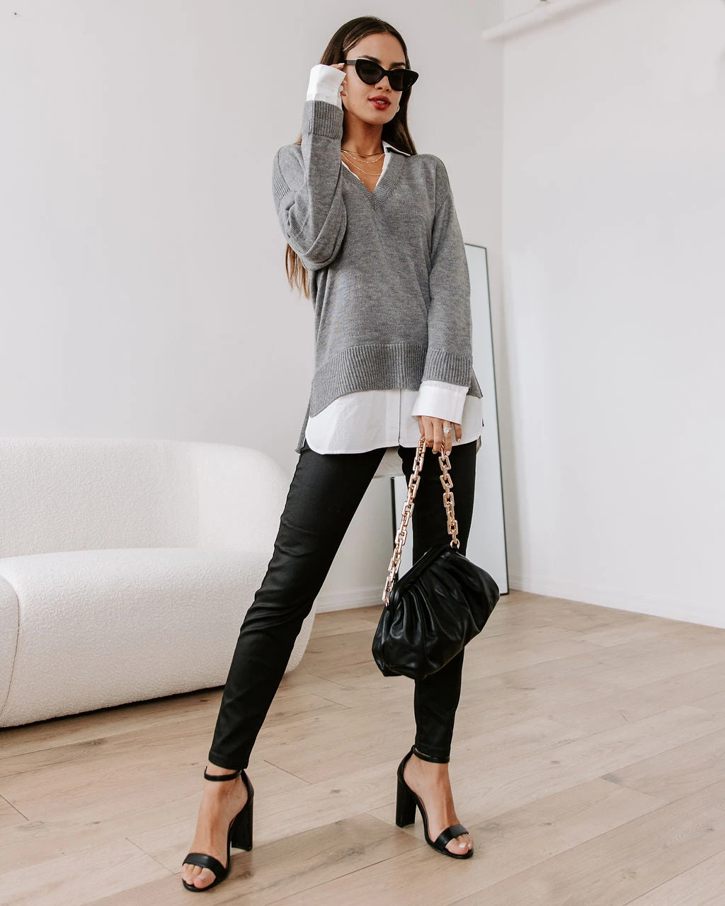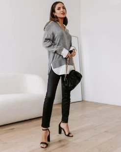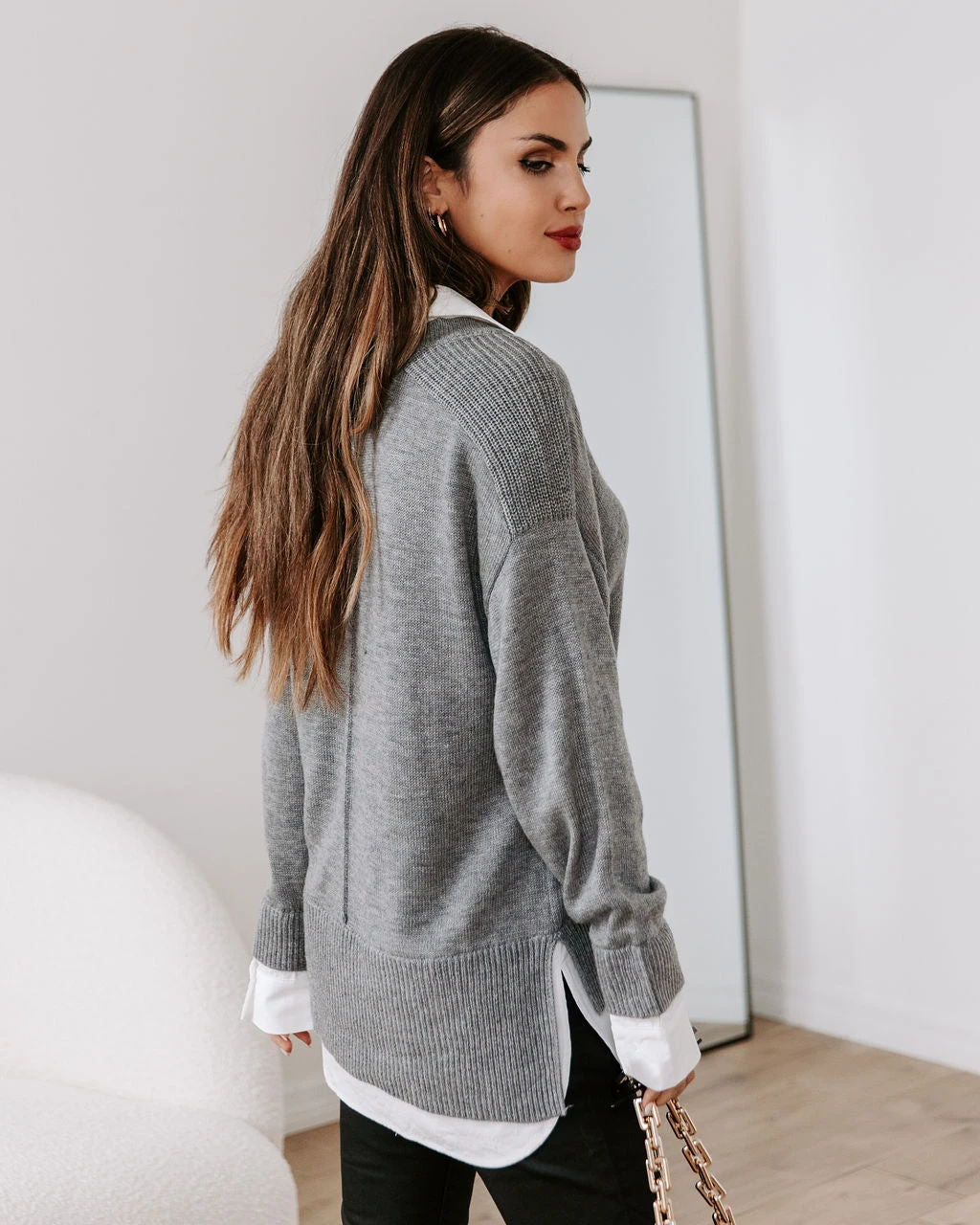 Preppy meets comfy in the Get Down To Biz Knit Contrast Sweater in grey that features a collar.