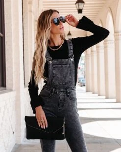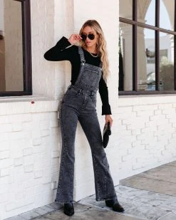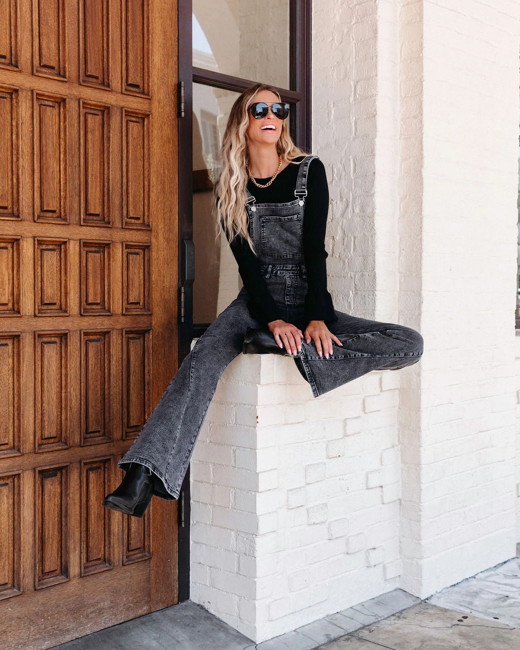 Hop on the overall trend in the Brady Bell Bottom Pocketed Overalls in washed black that features a side zipper closure.