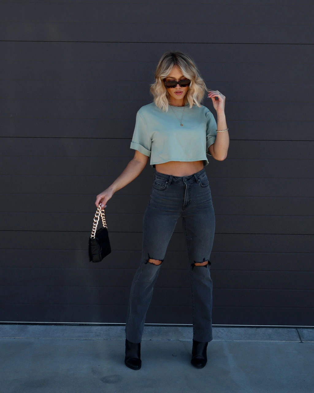 Meet the new weekend warrior. The Charlize Cotton Cropped Tee in Sage is a weekend essential for every wardrobe.