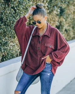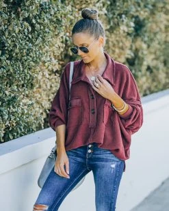Stroll the shops on a Sunday in our Kiandra Cotton French Terry Henley Top! This burgundy colored top features front henley button closures. Designed with frayed edges and bust pockets. Styled with the Chloe Mini Necklace, Mosaic Coin Necklace, Simple Bangle Bracelet, Highland Bag, Tilley Frayed Ankle High Waisted Skinny, and Uptown Faux Suede Heeled Bootie.