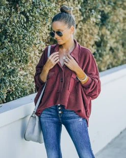 Stroll the shops on a Sunday in our Kiandra Cotton French Terry Henley Top! This burgundy colored top features front henley button closures. Designed with frayed edges and bust pockets. Styled with the Chloe Mini Necklace, Mosaic Coin Necklace, Simple Bangle Bracelet, Highland Bag, Tilley Frayed Ankle High Waisted Skinny, and Uptown Faux Suede Heeled Bootie.