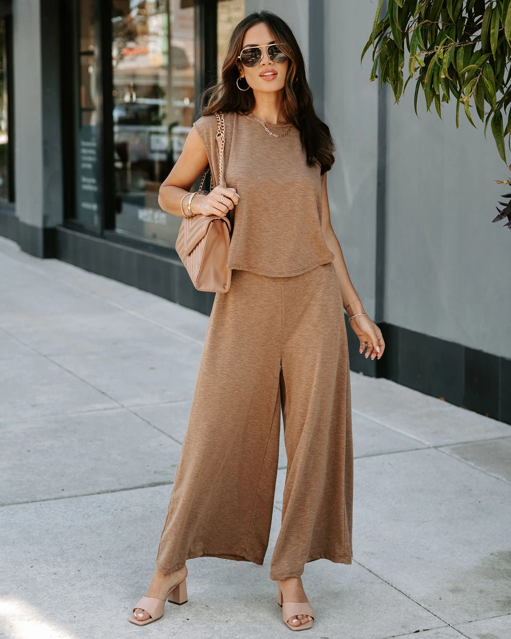 Every wardrobe needs the Not What It Seems Pocketed Jumpsuit in Mocha with the wide pant leg and open neckline.