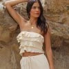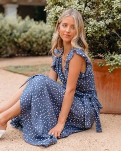 Go wine tasting in this polka dot set! Our Ofelia Cotton Polka Dot Tie Front Crop Top is dusty blue with ivory printed polka dots and a plunging neckline. Finished with a front tie closure. Styled with the Indigo Twisted Hoops, Chloe Mini Necklace, Elena Pendant Necklace, Compass Coin Necklace, Simple Bangle Bracelet, Stella Crossbody Envelope Zip Clutch, Ofelia Cotton Polka Dot Wrap Maxi Skirt, and Misty Faux Leather Heeled Sandal.