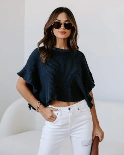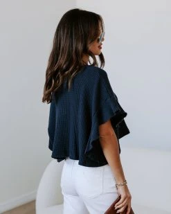 Fun meets flirty in the Shay Waffle Knit Ruffle Top in Navy that’s cropped perfectly to fit with your favorite high waisted pants.