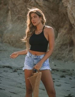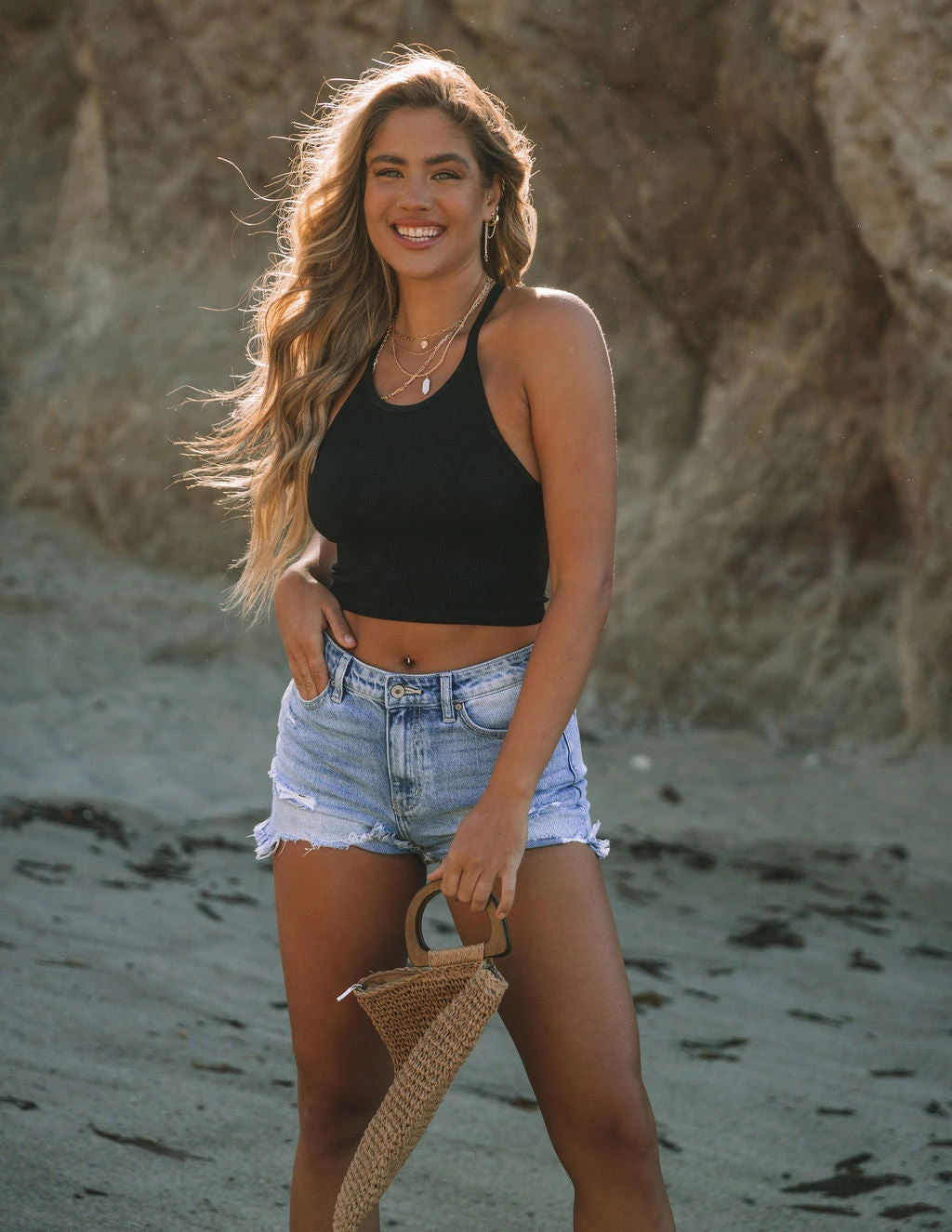 //Best Seller//New Color// The brami that goes with everything! Our Cardinal Ribbed Racerback Brami is fitted and flattering with a high neckline. This black top looks fab with anything from skirts, to shorts, to pants! Styled with the Coasta Layered Pendant Necklace, Toledo Woven Straw Handbag, and Amanda High Rise Distressed Denim Shorts.Β
