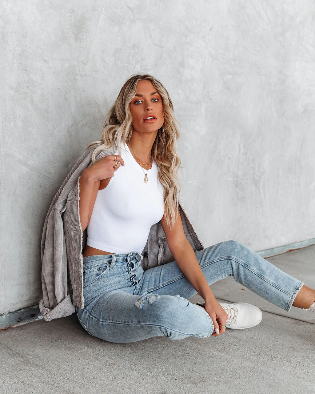 Show some skin in our Ciara Seamless Crop Top! This white fitted crop features a crew neckline, sleeveless silhouette, and stretchy seamless fabric. Perfect worn on its own or layered under outerwear. Styled with the Perfect Hoop Earrings, Chloe Mini Necklace, Initial Card Necklace, Condola Cotton Pocketed Corduroy Jacket, Kason Distressed High Rise Denim, Willa Heeled Lace Up Boot, and Highland Bag.