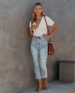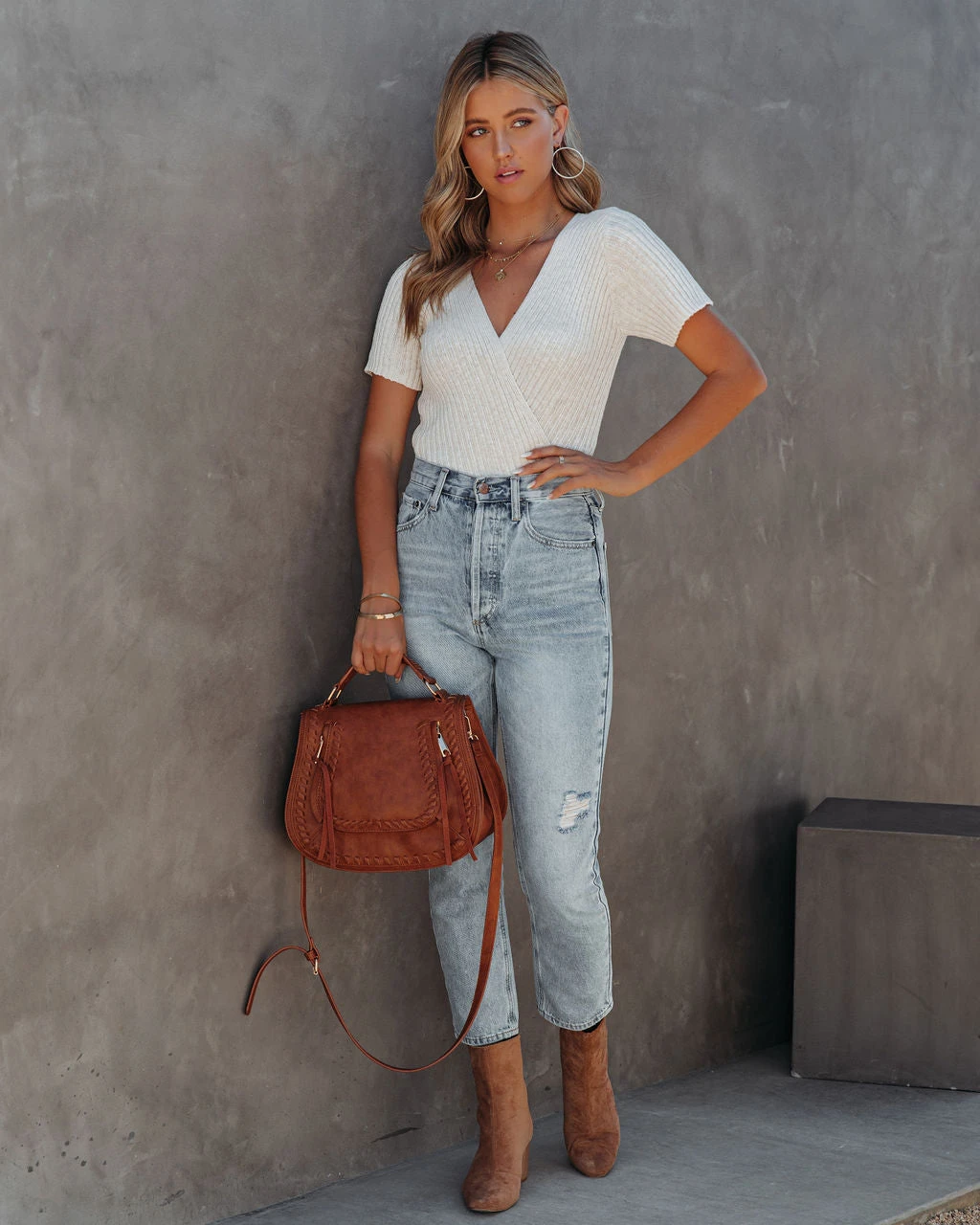Our Drake Cotton Blend Drape Crop Top makes any outfit look chic! This cream colored sweater top is crafted with a draped neckline and short sleeves. Tuck this top into high waisted denim paired with suede booties! Styled with the Perfect Hoop Earrings, 5 Disc Choker, Chloe Mini Necklace, Gaia Coin Necklace, Simple Bangle Bracelet, Highland Bag, Kason Distressed High Rise Denim, and Colby Faux Suede Heeled Bootie.