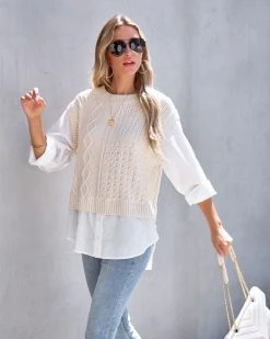 Preppy and cozy, the Ginsburg Cotton Cable Knit Vest Blouse in cream and white features a crew neckline.