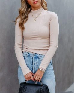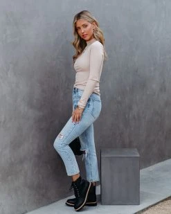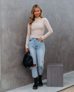 //Best Seller// Turtlenecks look so chic under an oversized blazer! Our Norton Mock Neck Knit Top comes in a classic sand hue. Designed in a micro rib knit with a mock neckline and long sleeves. Styled with the Perfect Hoop Earrings, Gaia Coin Necklace, Chloe Mini Necklace, Simple Bangle Bracelet, Highland Bag, Kason Distressed High Rise Denim, and Brycen Faux Leather Lace Up Boot.