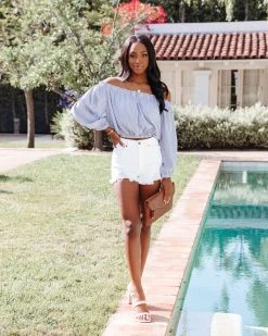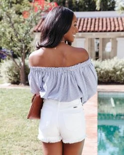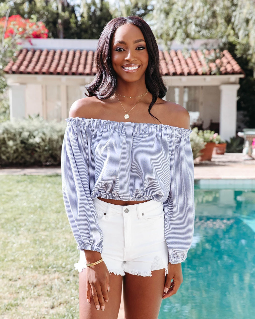 Show of your shoulders in the Toronto Striped Off The Shoulder Crop Top in blue that features front button closures.