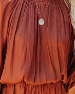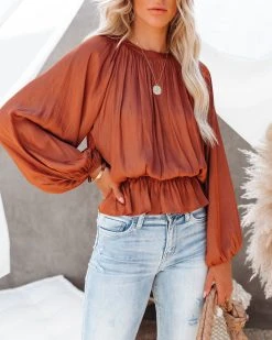 Satin blouses are the perfect office look! Our Cappa Satin Peplum Blouse comes in a stunning clay satin. Designed with a crew neckline and an elastic peplum hemline. Styled with the Perfect Hoop Earrings, Mosaic Coin Necklace, Simple Bangle Bracelet, Harper Woven Faux Leather Handbag, Mcguire High Rise Distressed Denim, and Felicia Twisted Faux Suede Heeled Sandal.
