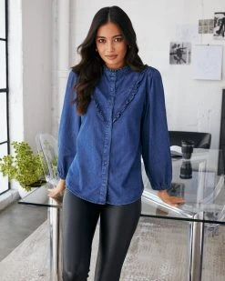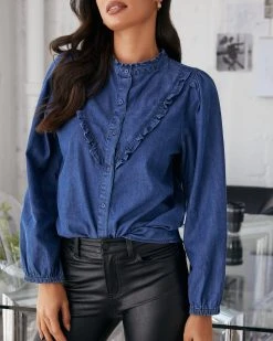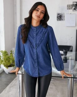 //VICI Exclusive// Our Mavi Tencel Button Down Ruffle Top will cue up some compliments in the office! This dark wash chambray button down top pairs best with black denim. Secured with front button closures. Styled with the Mercury Hoops, Estelle High Rise Faux Leather Skinny, and Jocelyn Heeled Bootie.