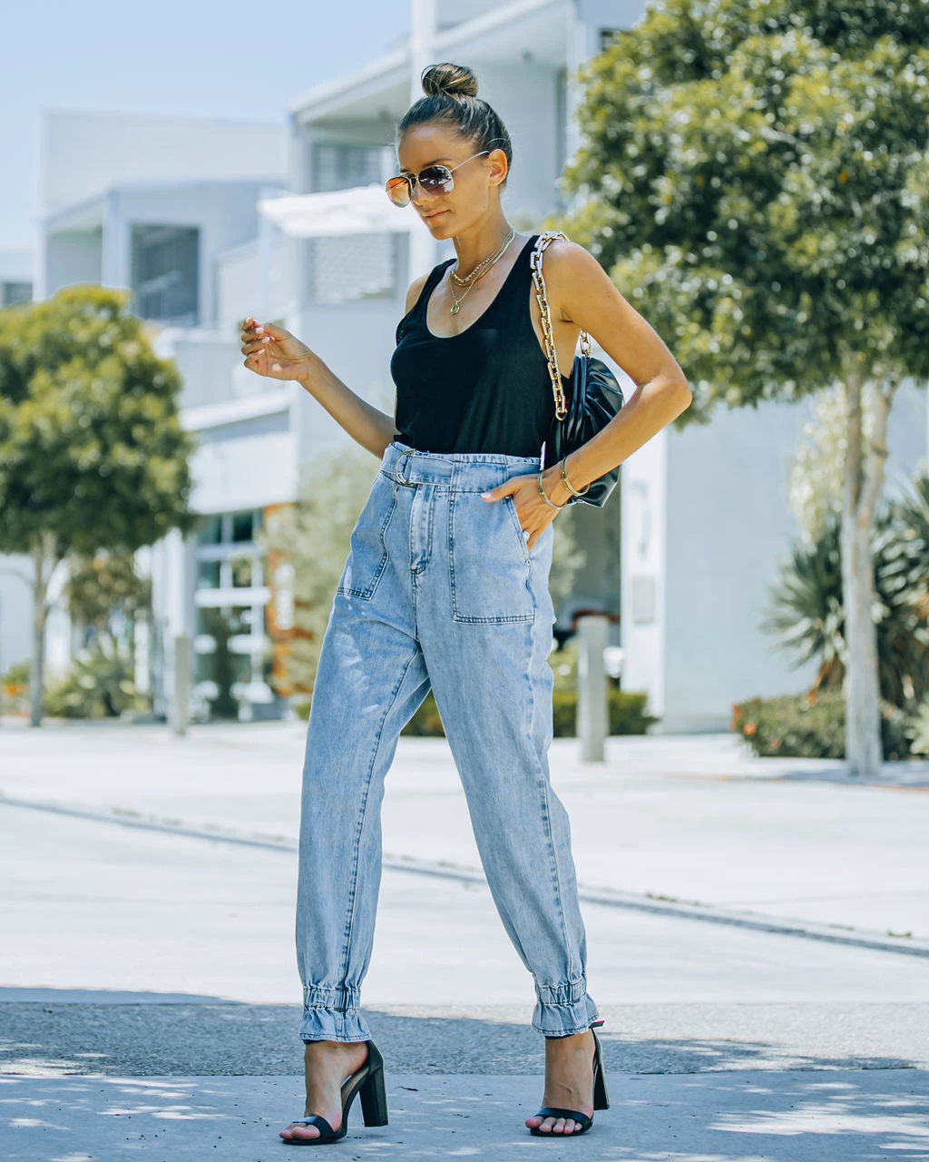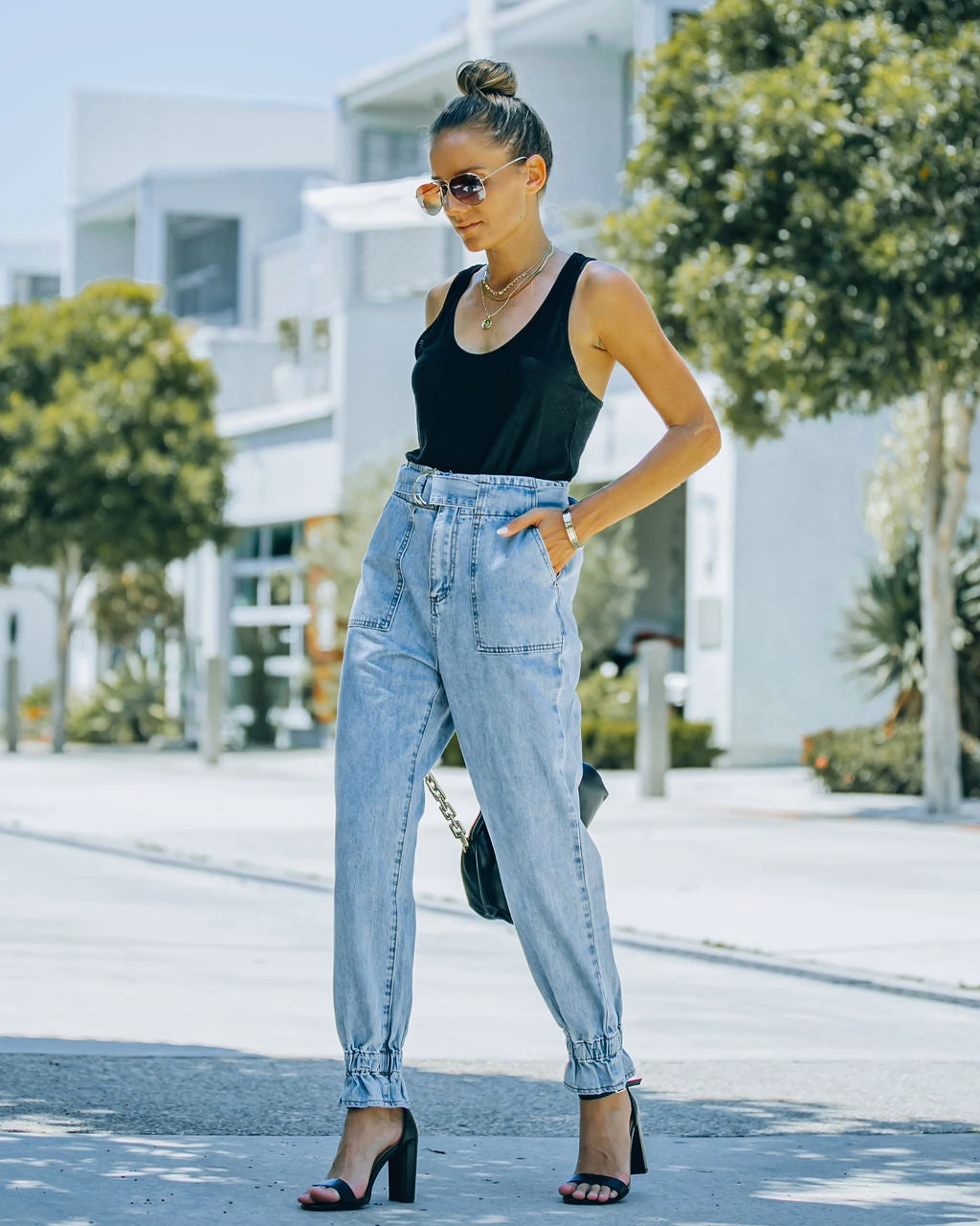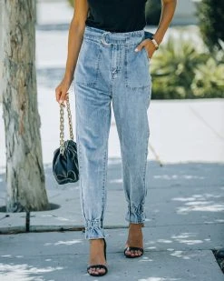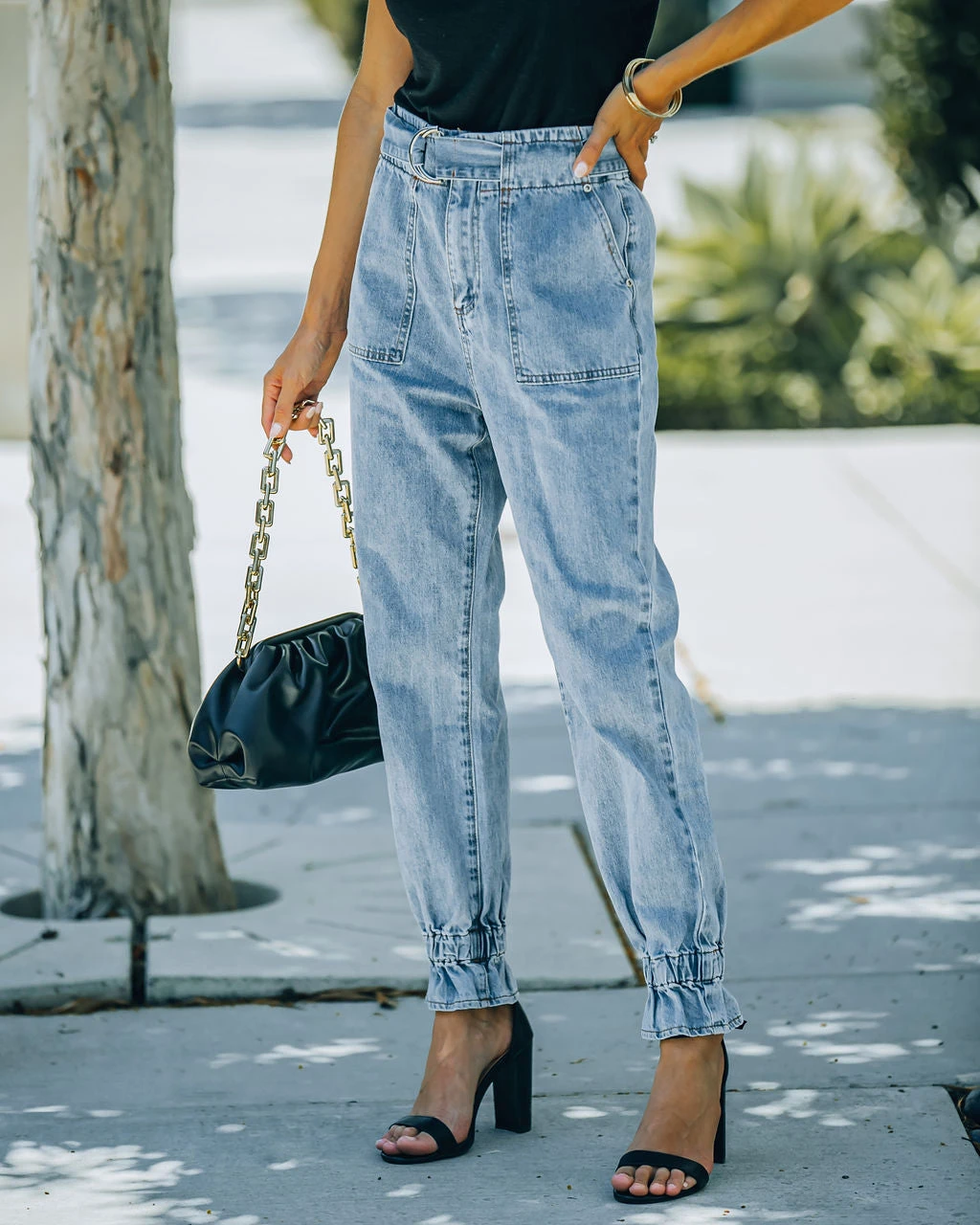 Jogger denim is such a hot trend! Our Rena High Rise Belted Denim Pants are light wash with no stretch. Decorated with elastic ruffle ankles. These relaxed pants have a front zipper closure. Styled with the Chloe Mini Necklace, Compass Coin Necklace, Minimal Herringbone Necklace, Simple Bangle Bracelet, Chic Crossbody Chain Pouch Bag, Physique Racerback Tank, and Whimsy Heel.