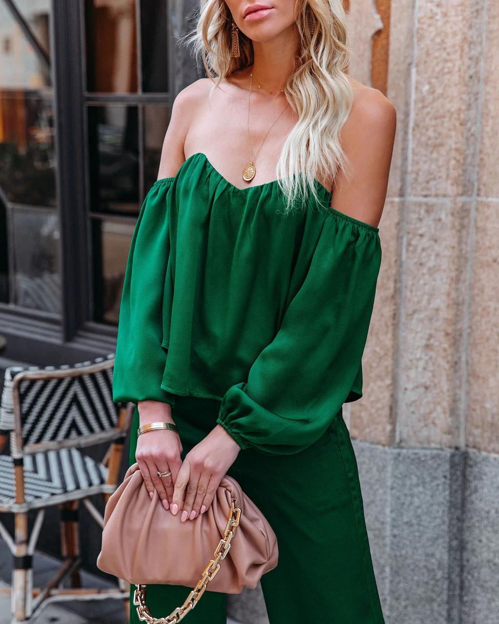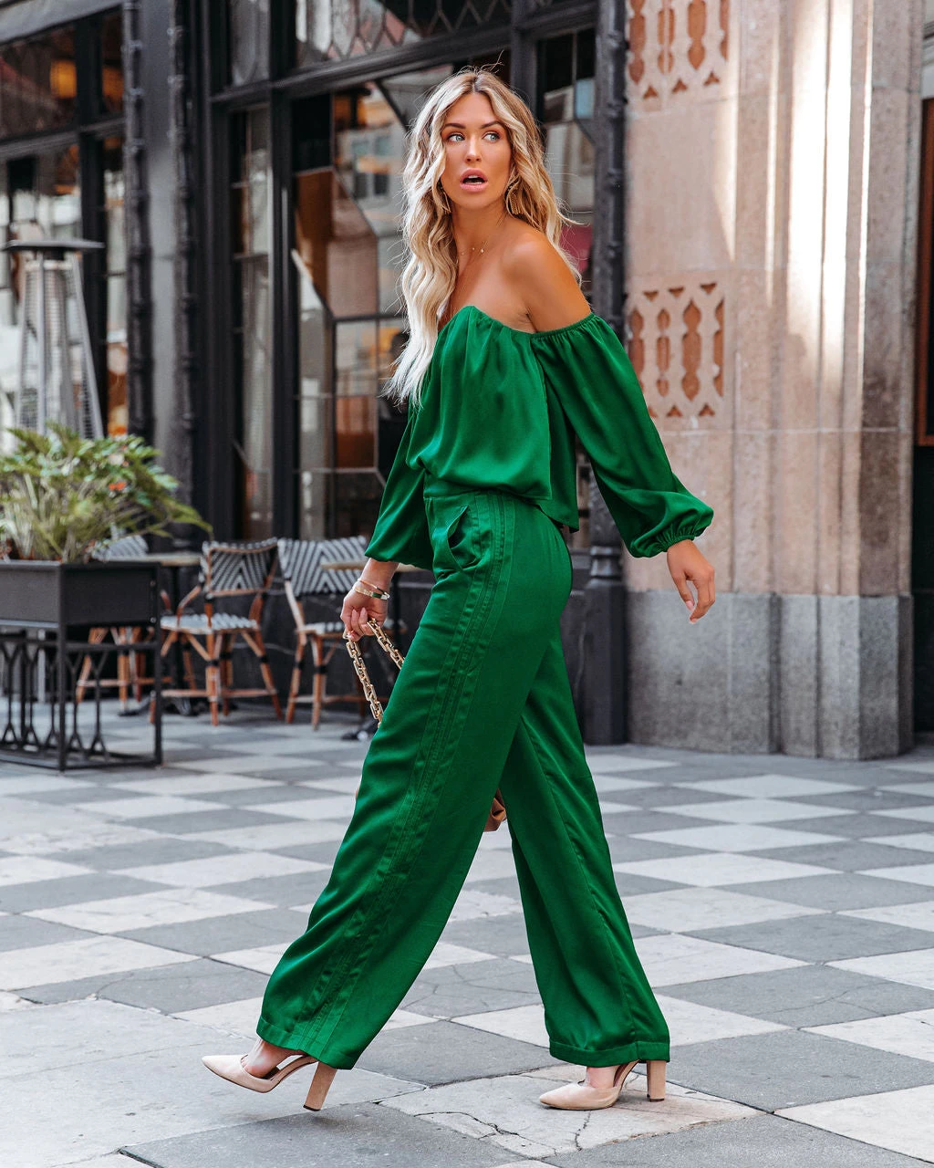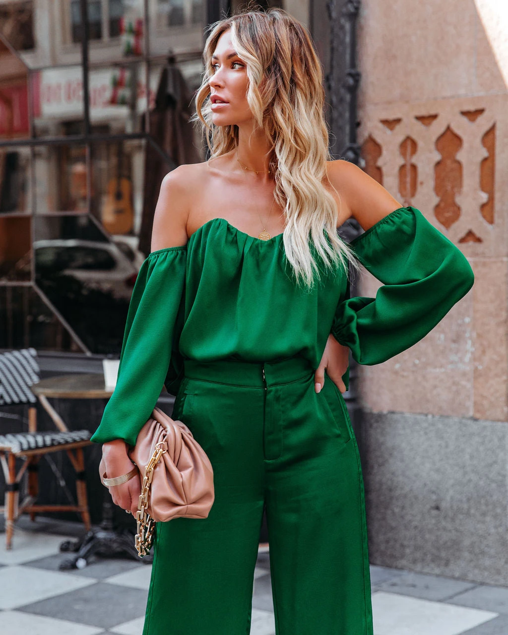 //VICI Exclusive//Best Seller// There’s nothing more festive than a silk set! Our Clockwork Satin Off The Shoulder Blouse comes in emerald. Designed with sweetheart neckline and elastic hems. Finished with a back exposed zipper closure. Styled with the Glow Up Earrings, The Buddha Wheel Necklace, Crystal Droplet Choker, 5 Disc Choker, Chic Crossbody Chain Pouch Bag, Clockwork Pocketed Satin Wide Leg Trousers, and Ritz Faux Suede Pointed Heel.