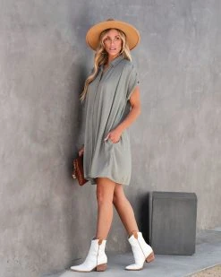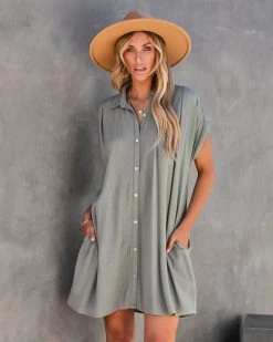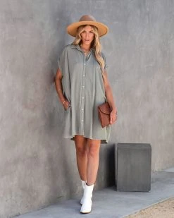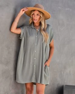 Upgrade your style in the Hamptons Pocketed Button Down Tunic in olive that features a collar and side pockets.