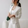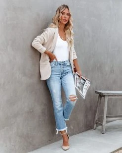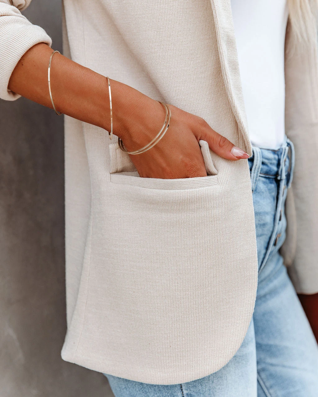 //Best Seller// Sophistication meets chicness in the Skyline Pocketed Knit Blazer in beige that’s detailed with a shawl collar.