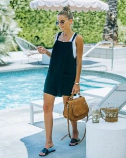 //Best Seller// New Color// Stay comfy and cool all day long in the Wear-Ever Linen Blend Pocketed Knot Romper in black with a square neckline and front pockets.ย